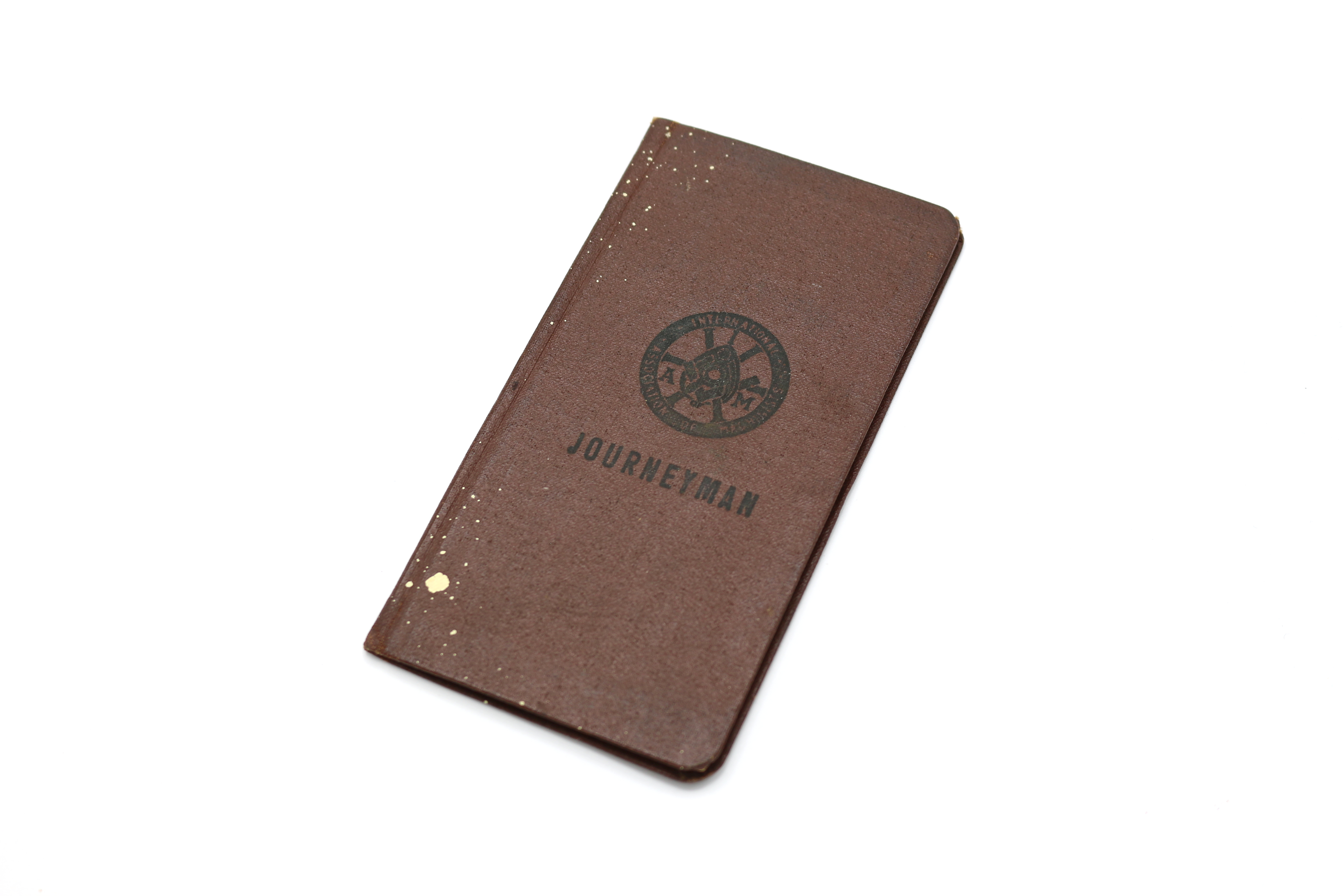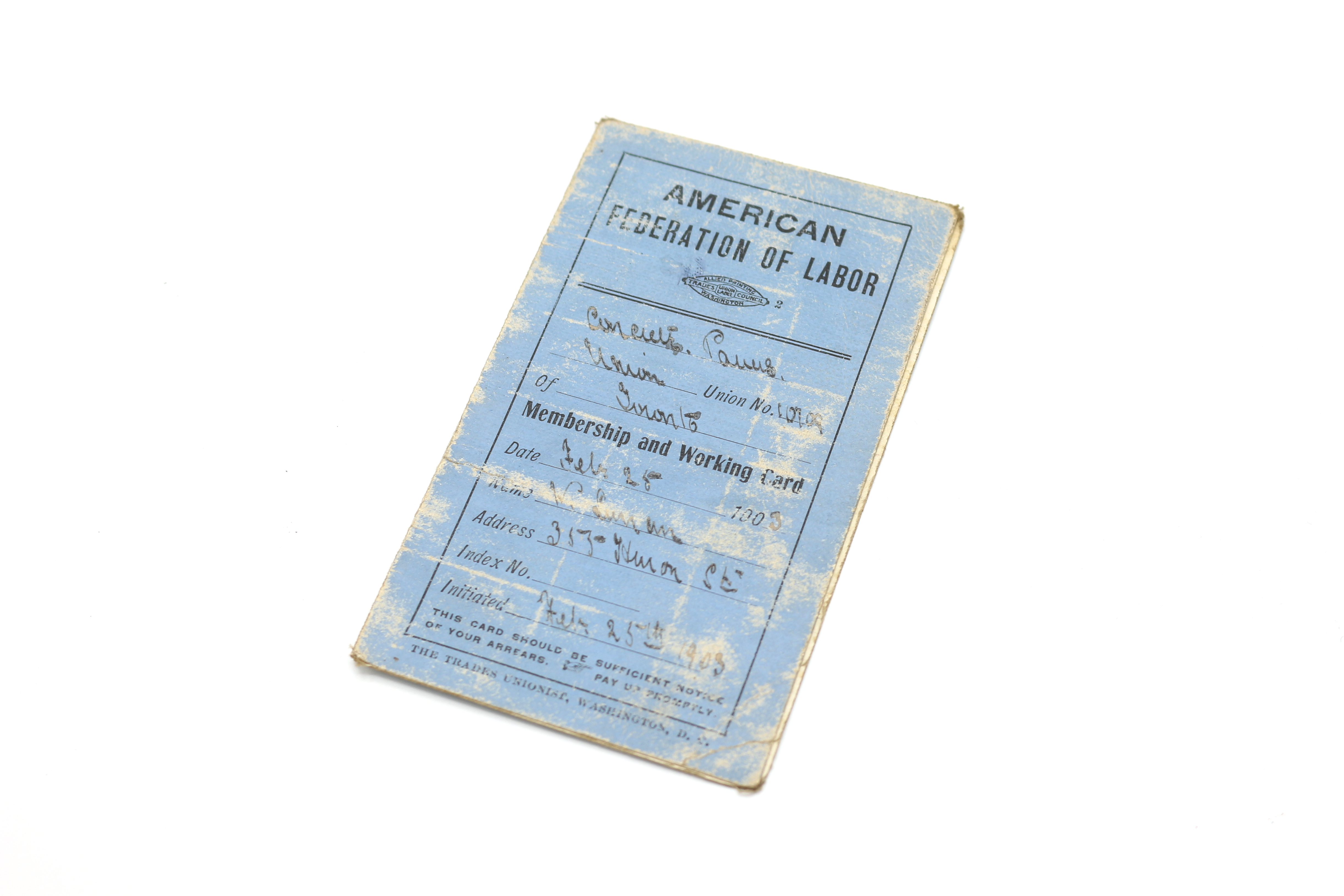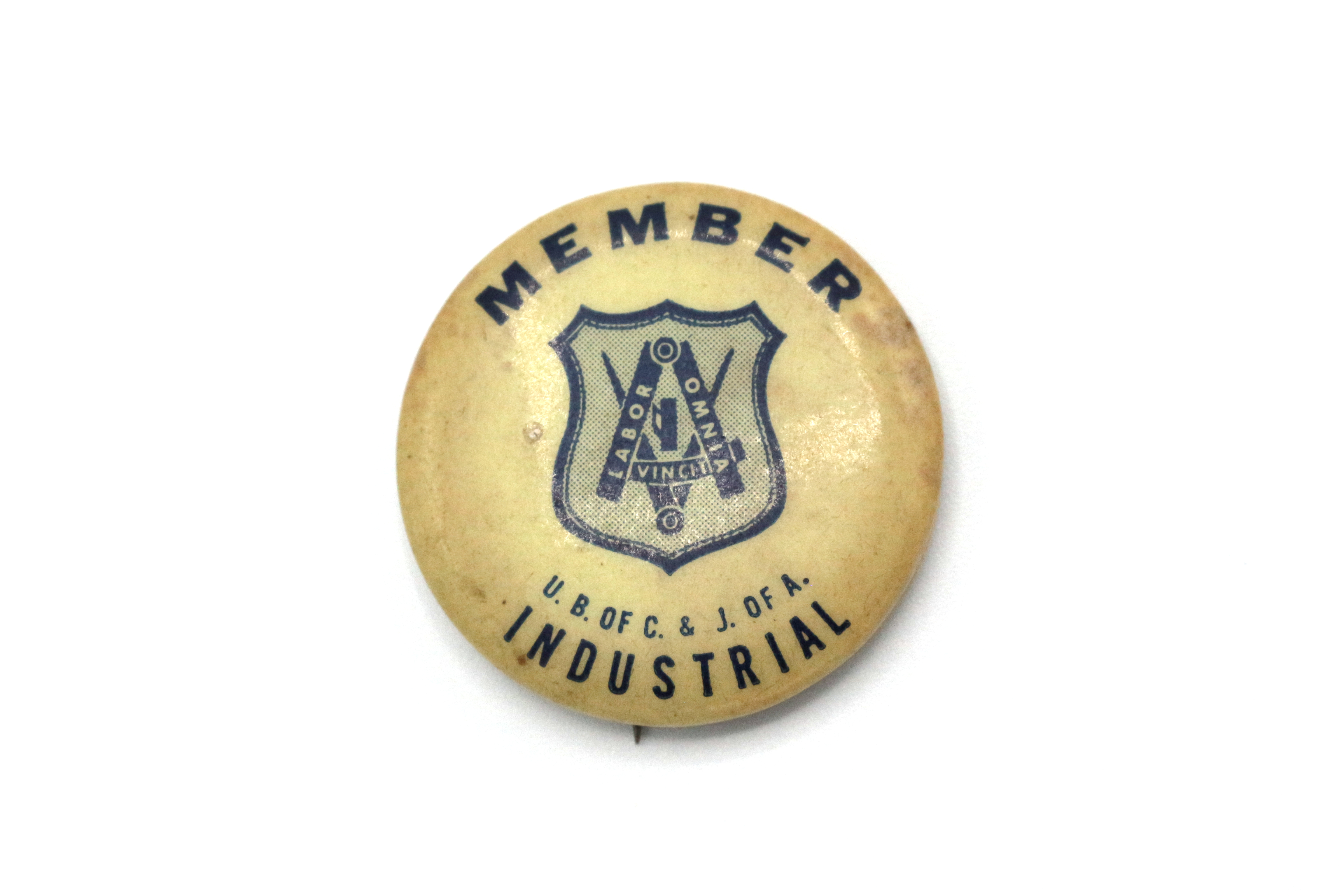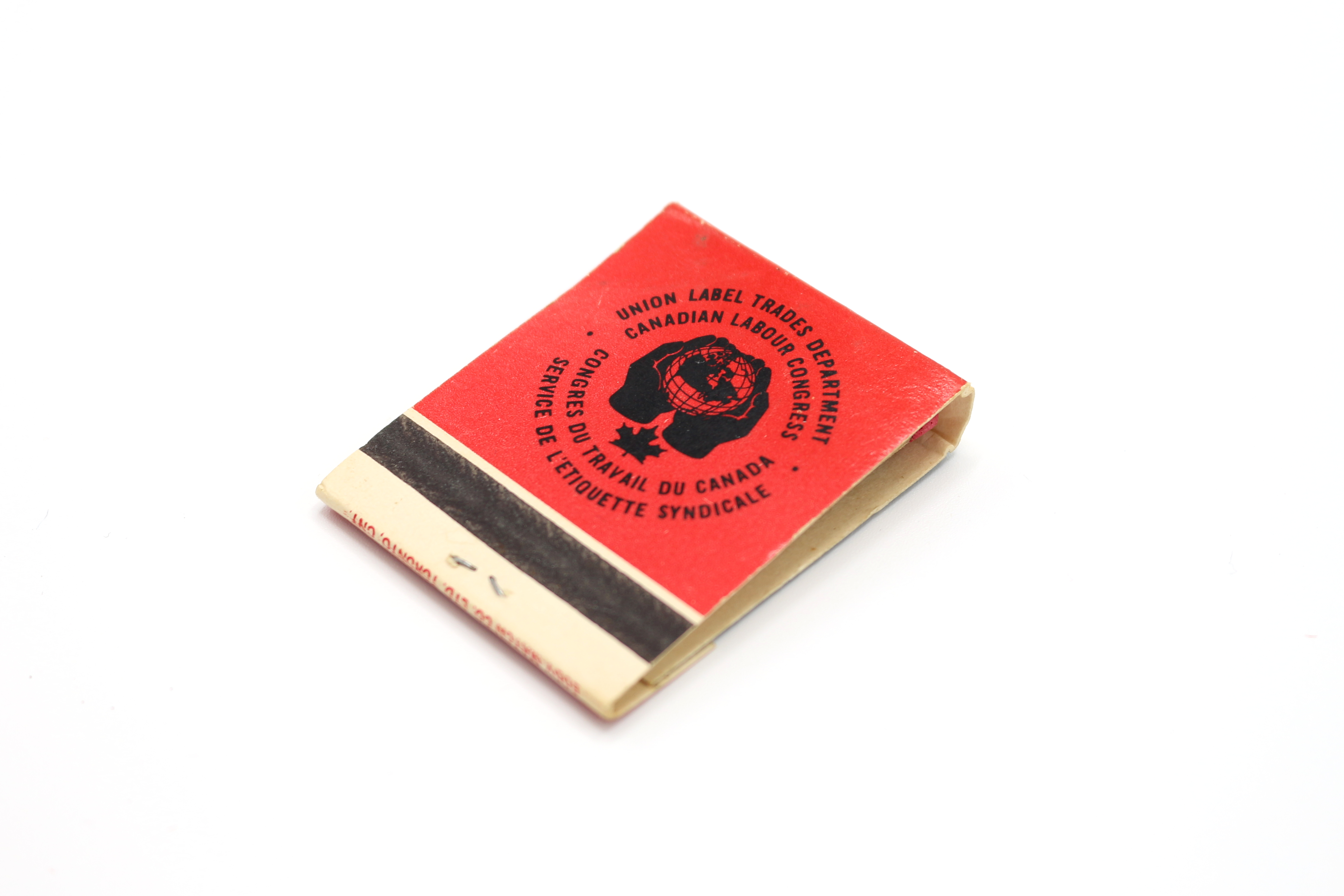 Many of these objects are evidence of individuals’ active union membership, such as delegate ribbons from union conventions, dues booklets/receipts, and union pin-back buttons and pins. Others are evidence of labour print history, such as letterpress cuts and union constitution booklets. There are union branded clothing objects such as a necktie, hats, and a briefcase, as well as labels and tags calling for union labels. Other objects include shirt buttons, sculptures, signs, educational materials, stickers, a tobacco pouch, postcards, matchbooks, lighters, and handbooks.
