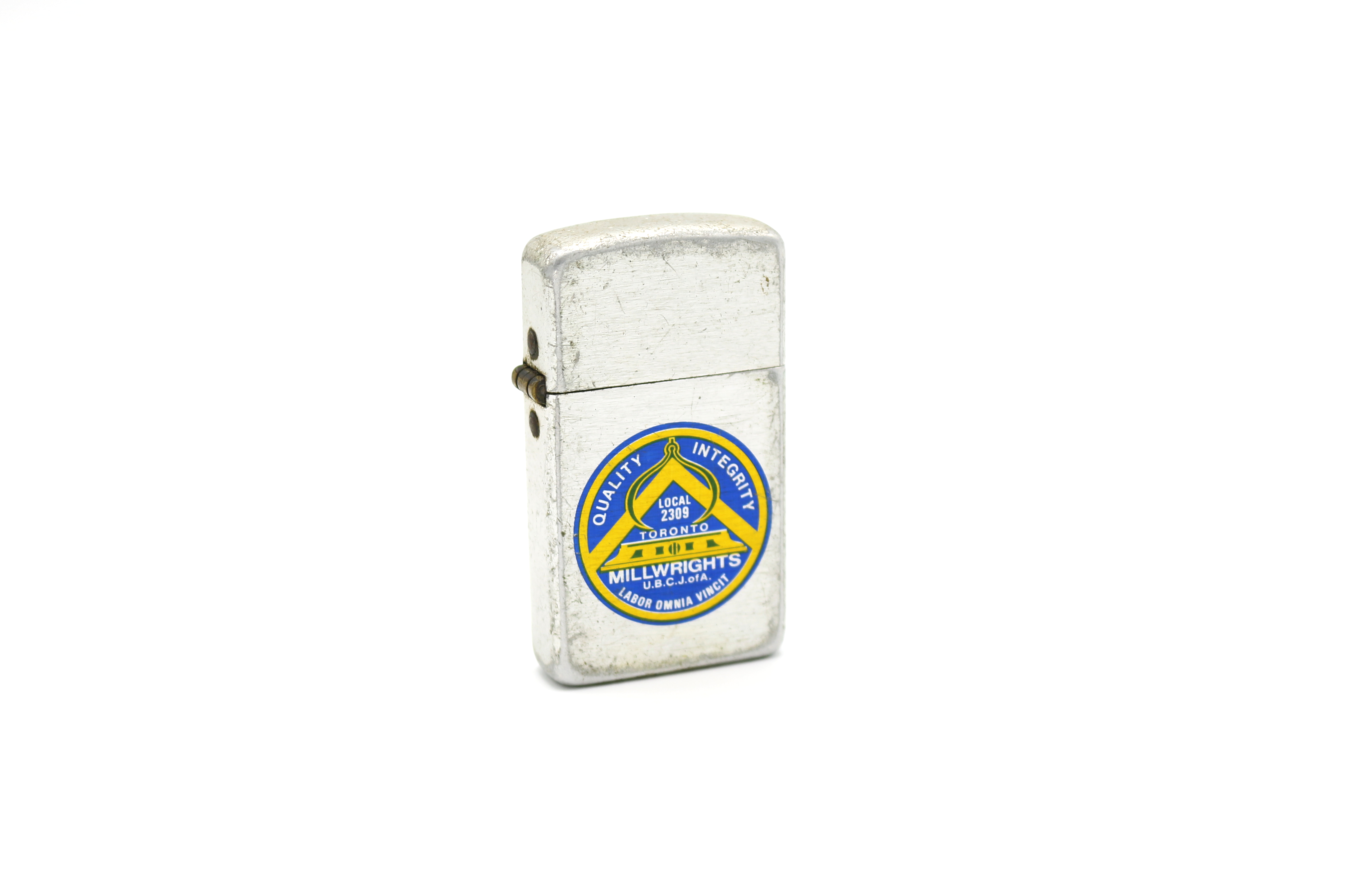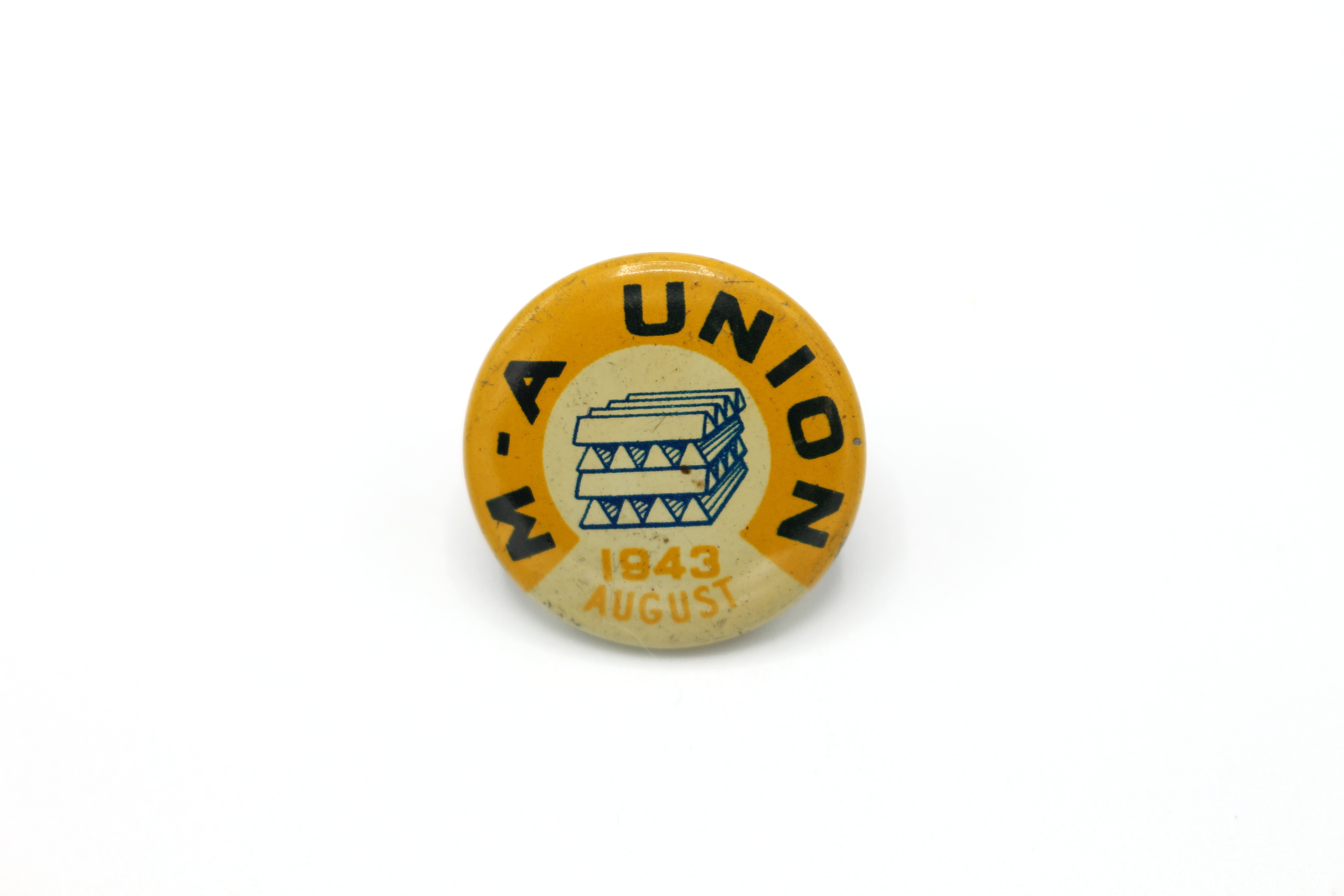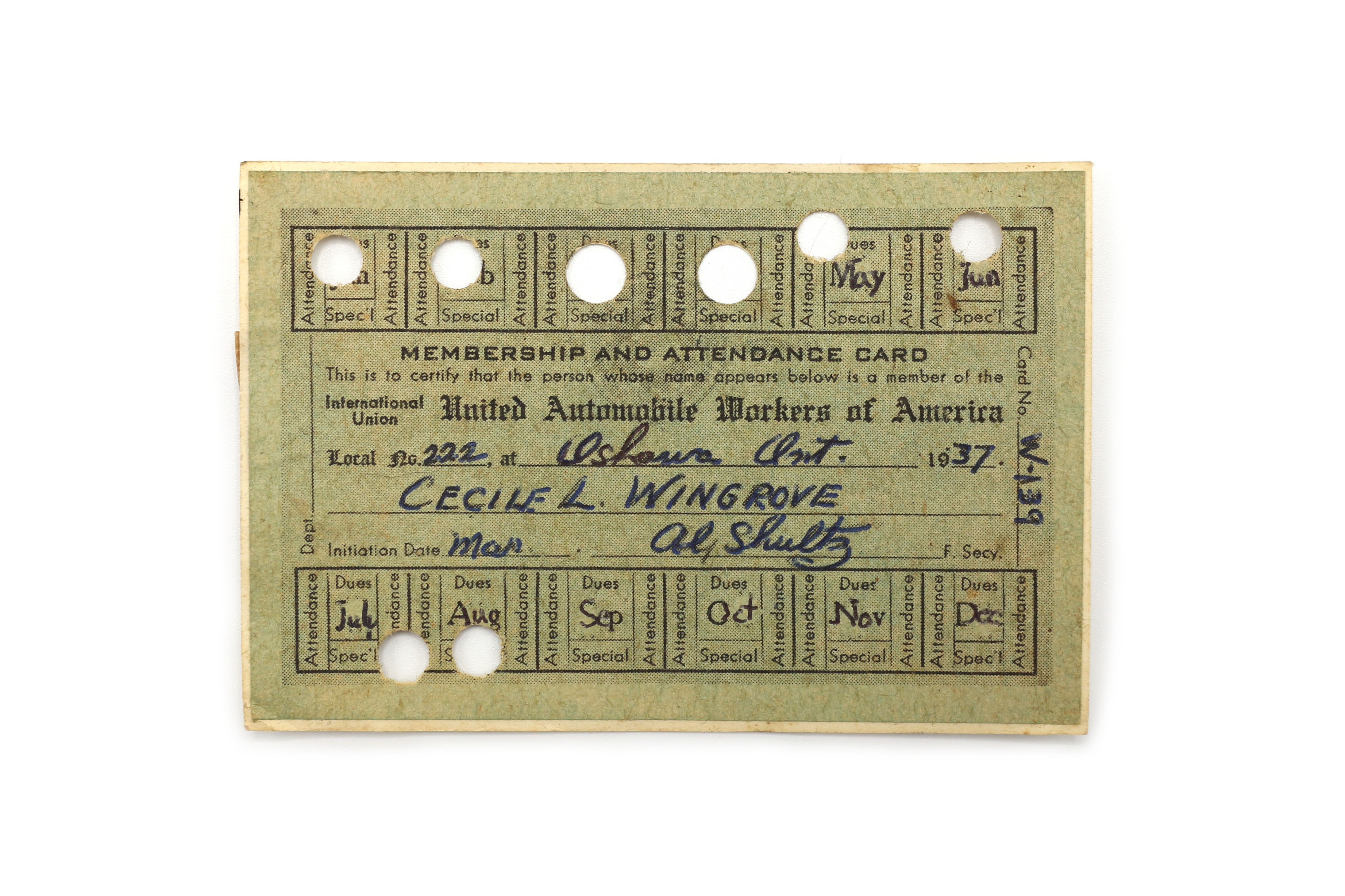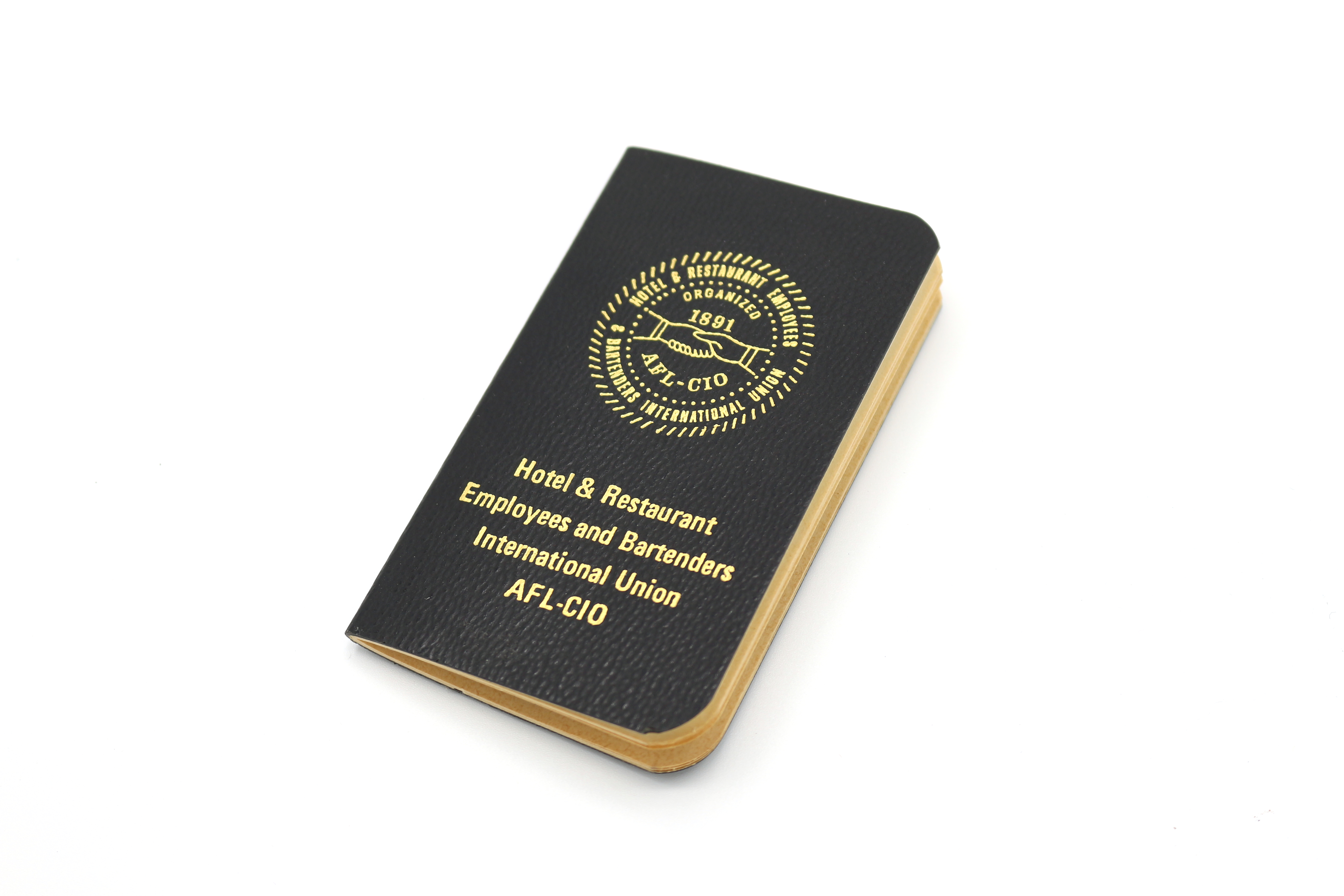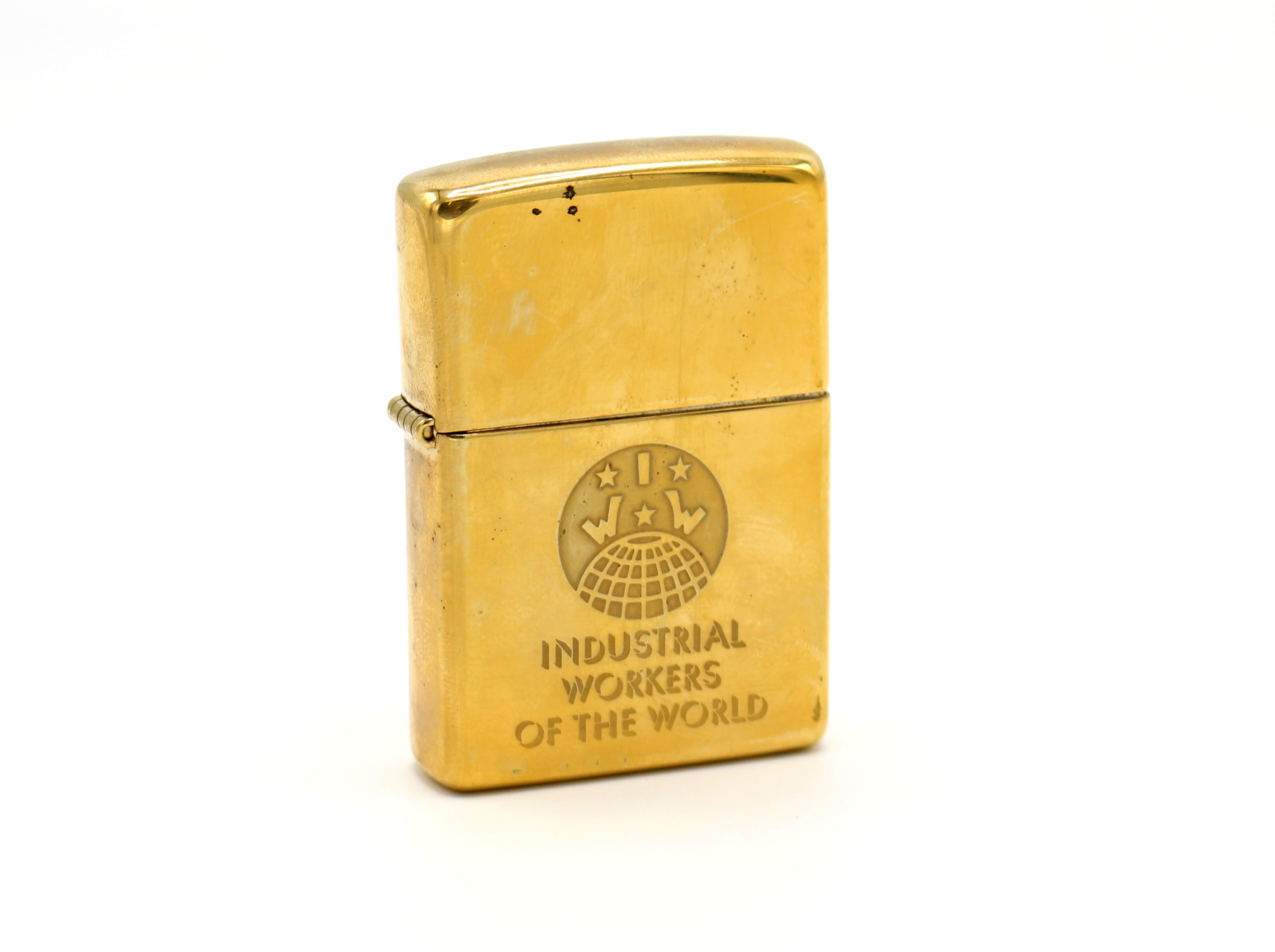 Many of these objects are evidence of individuals’ active union membership, such as delegate ribbons from union conventions, dues booklets/receipts, and union pin-back buttons and pins. Others are evidence of labour print history, such as letterpress cuts and union constitution booklets. There are union branded clothing objects such as a necktie, hats, and a briefcase, as well as labels and tags calling for union labels. Other objects include shirt buttons, sculptures, signs, educational materials, stickers, a tobacco pouch, postcards, matchbooks, lighters, and handbooks.