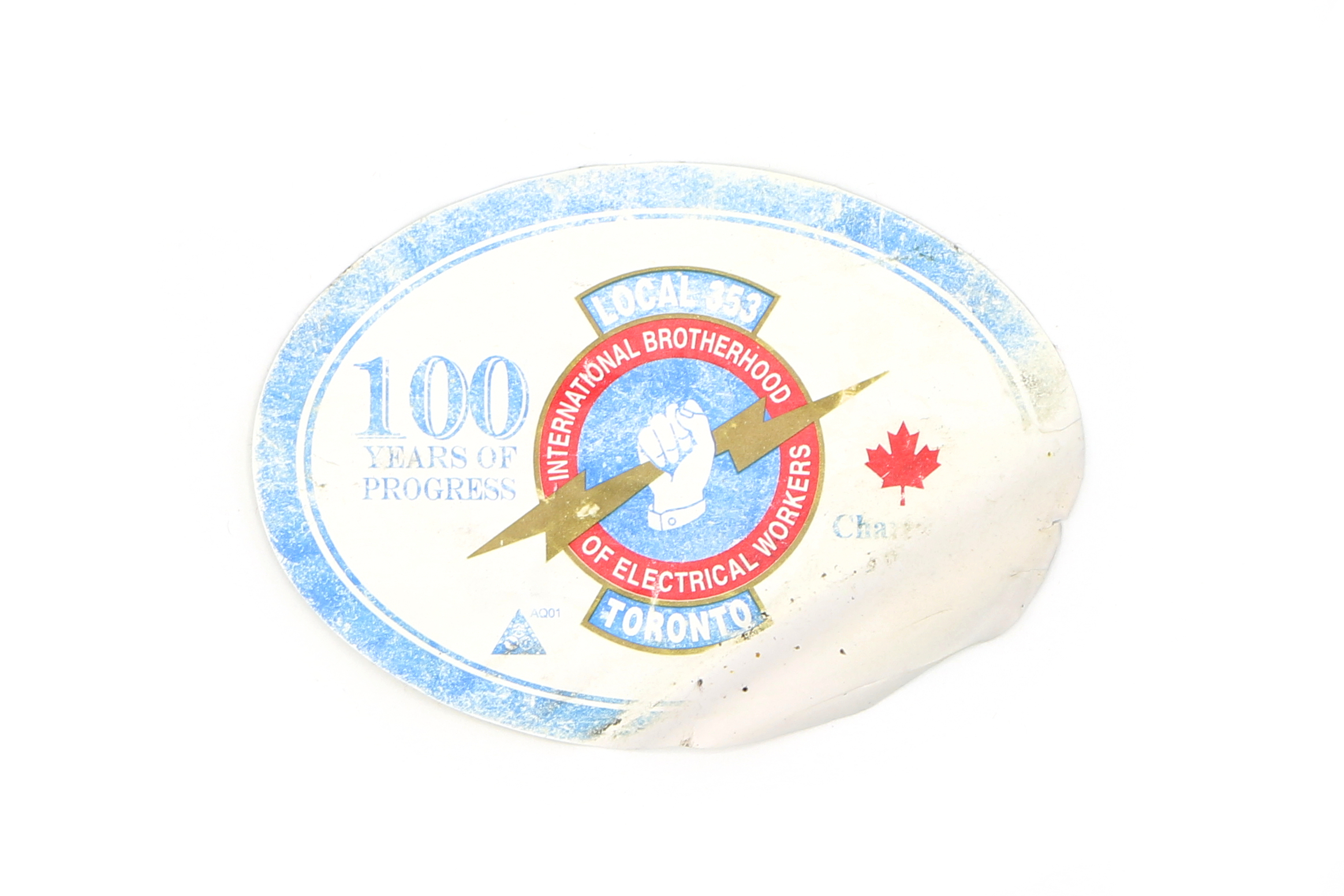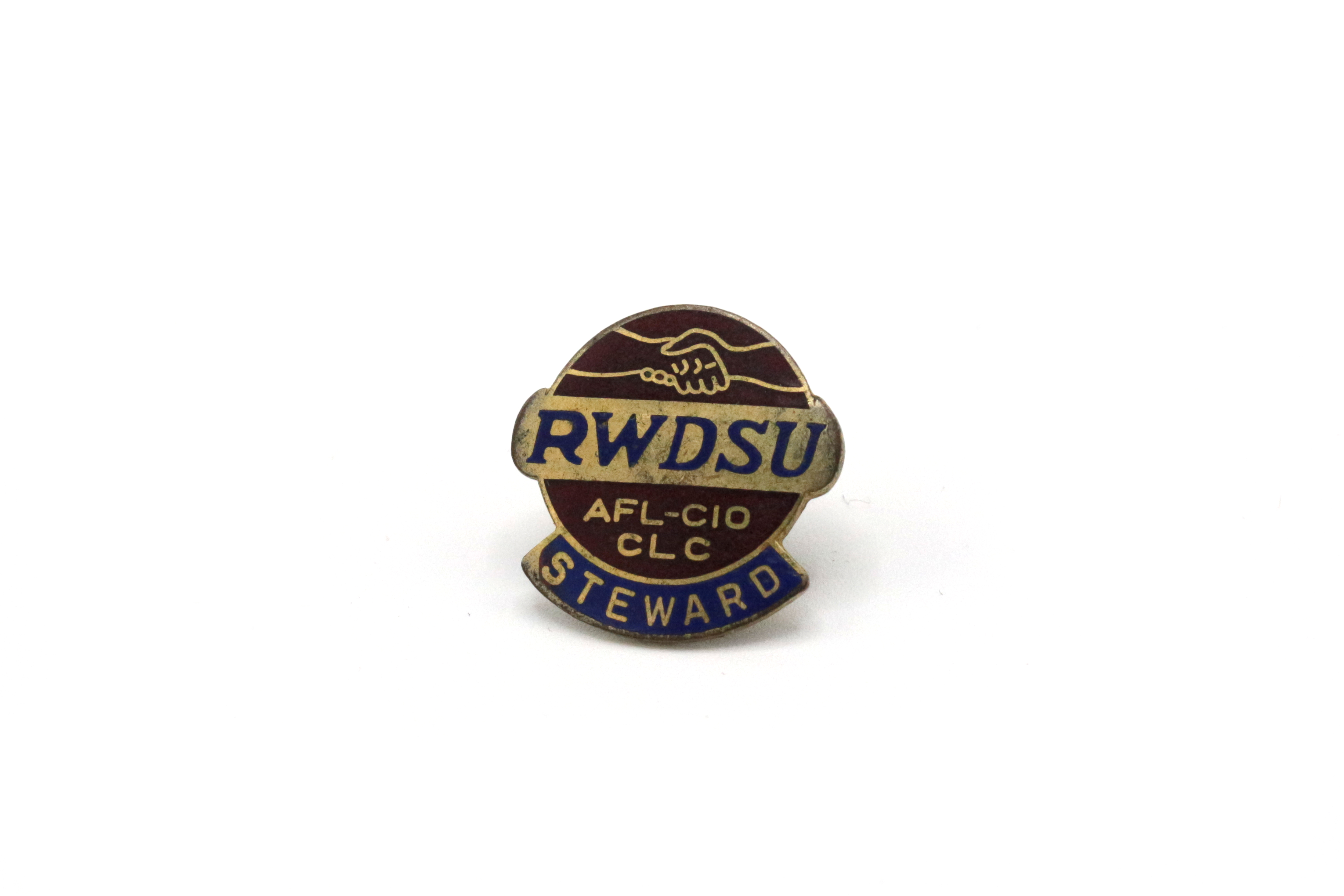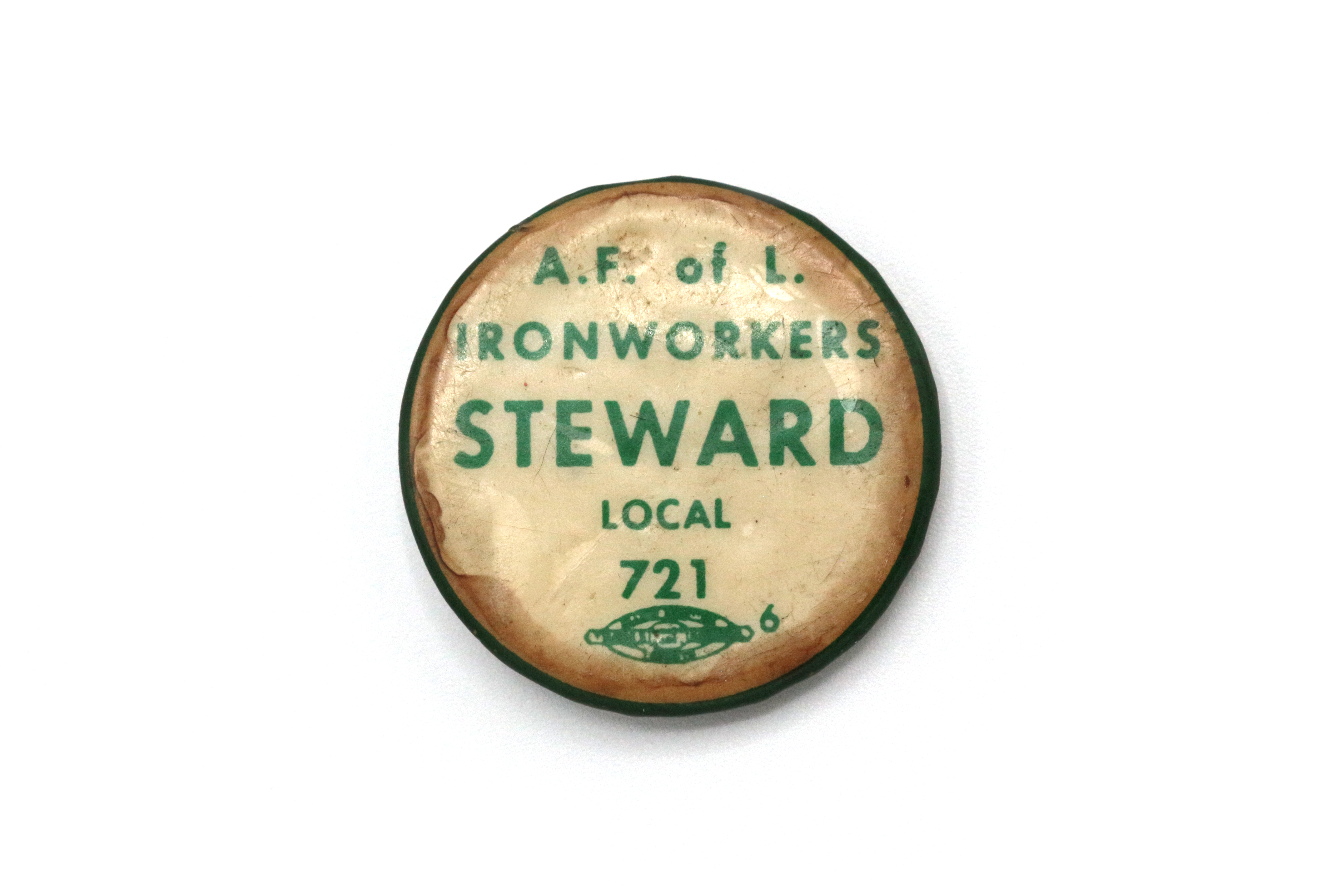 Many of these objects are evidence of individuals’ active union membership, such as delegate ribbons from union conventions, dues booklets/receipts, and union pin-back buttons and pins. Others are evidence of labour print history, such as letterpress cuts and union constitution booklets. There are union branded clothing objects such as a necktie, hats, and a briefcase, as well as labels and tags calling for union labels. Other objects include shirt buttons, sculptures, signs, educational materials, stickers, a tobacco pouch, postcards, matchbooks, lighters, and handbooks.