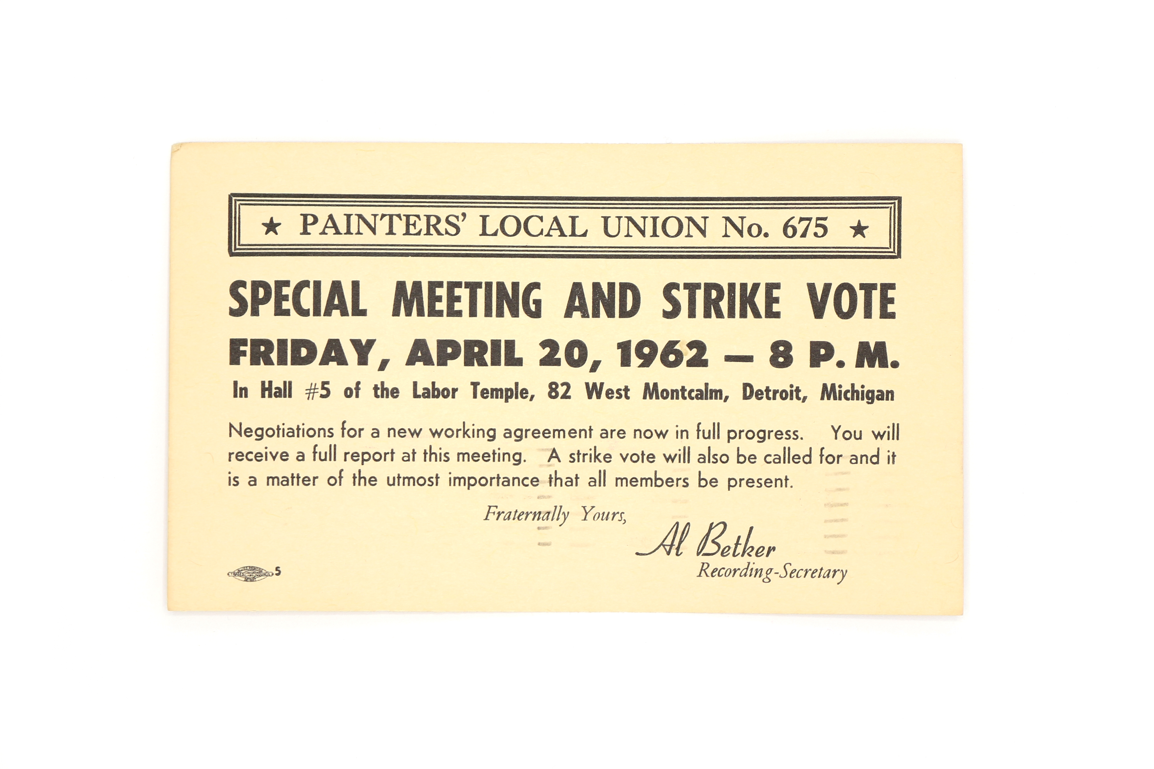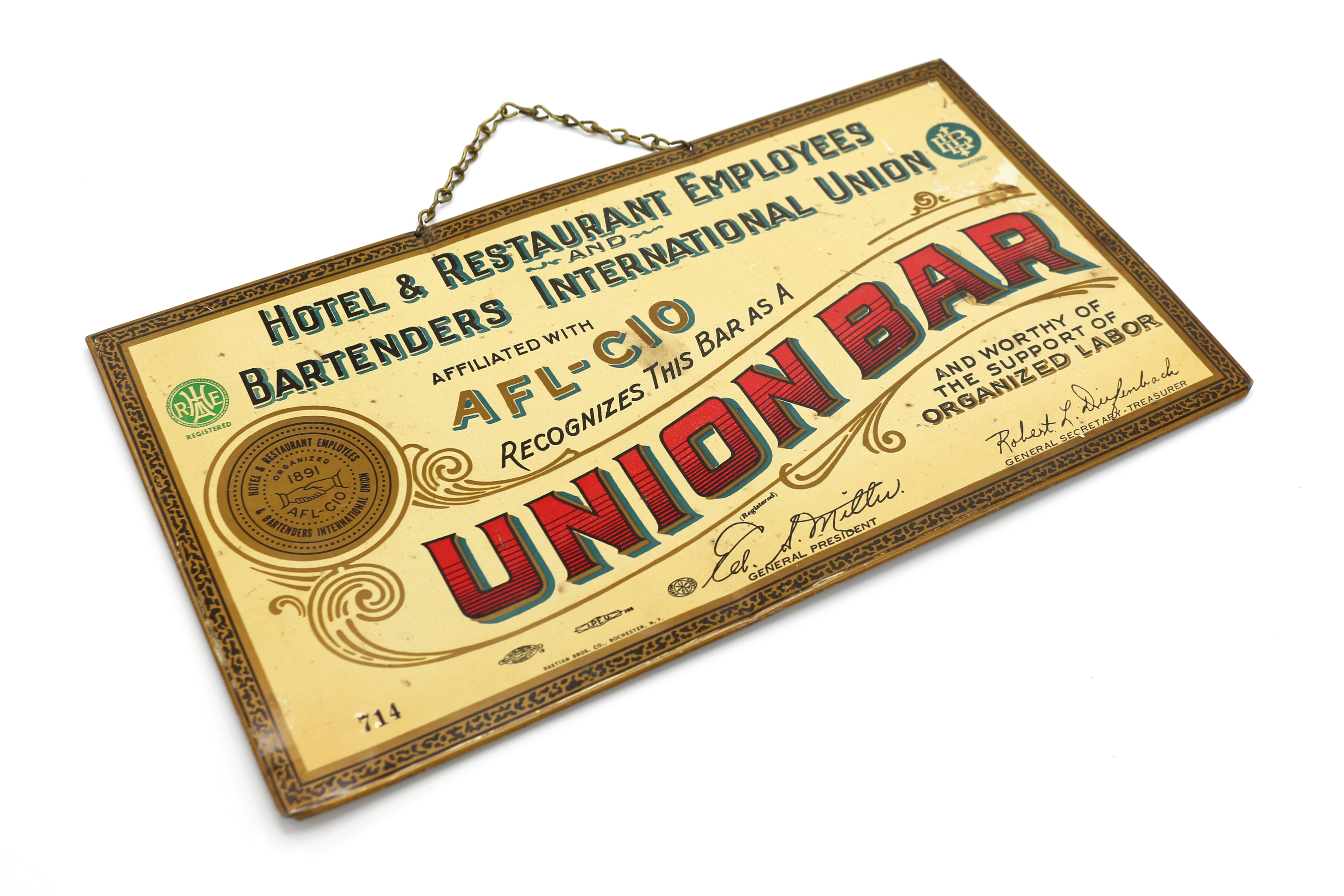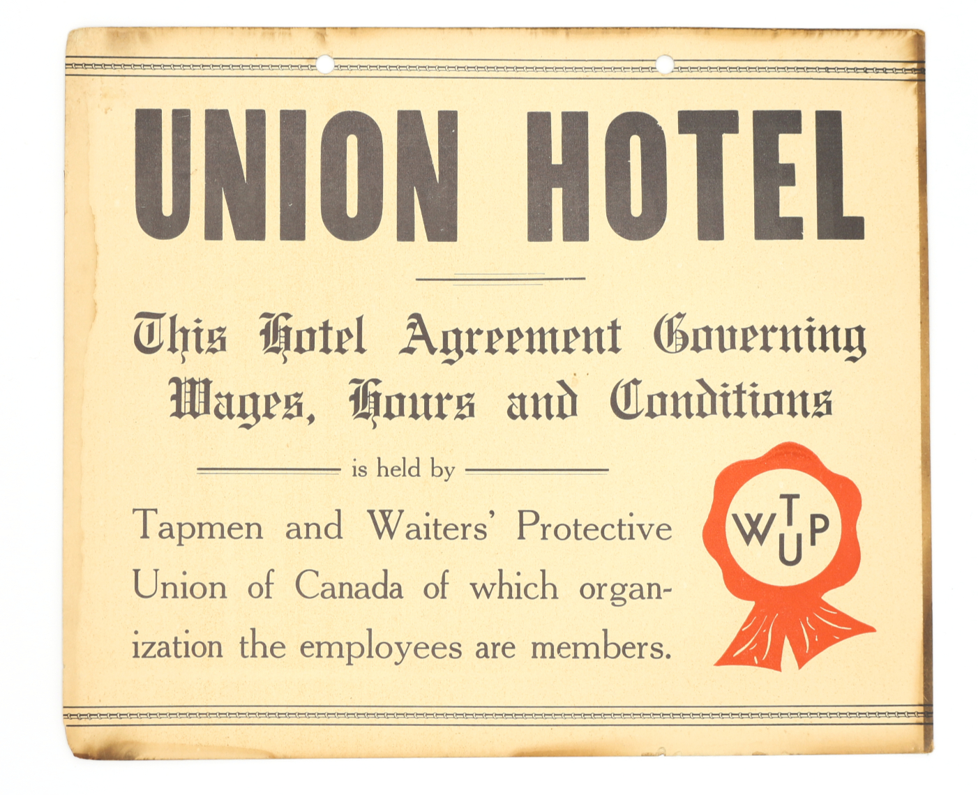 Many of these objects are evidence of individuals’ active union membership, such as delegate ribbons from union conventions, dues booklets/receipts, and union pin-back buttons and pins. Others are evidence of labour print history, such as letterpress cuts and union constitution booklets. There are union branded clothing objects such as a necktie, hats, and a briefcase, as well as labels and tags calling for union labels. Other objects include shirt buttons, sculptures, signs, educational materials, stickers, a tobacco pouch, postcards, matchbooks, lighters, and handbooks.